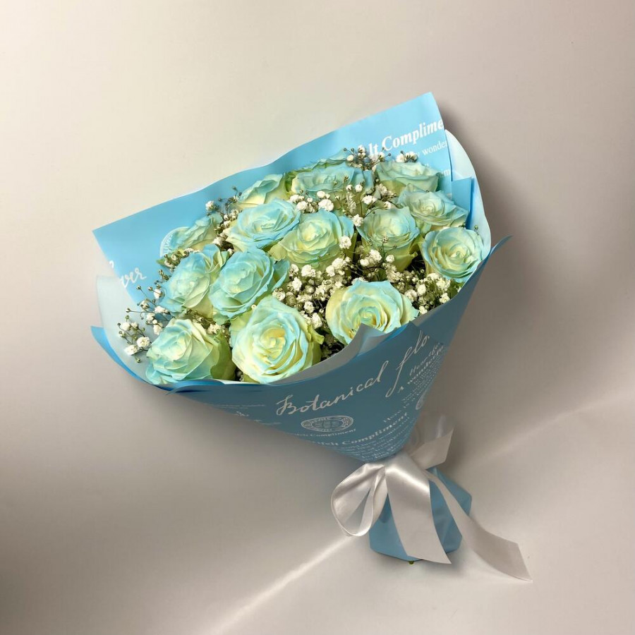 На фото букет из 15 голубых роз и гипсофилы. В составе: роза 15 шт, гипсофила 3 шт, дизайнерская упаковка 1 шт, атласная лента 1 шт, . Все цветы свежие и ароматные, букет красиво оформлен и отлично подходит для подарка. Доступна доставка цветов или самовывоз.