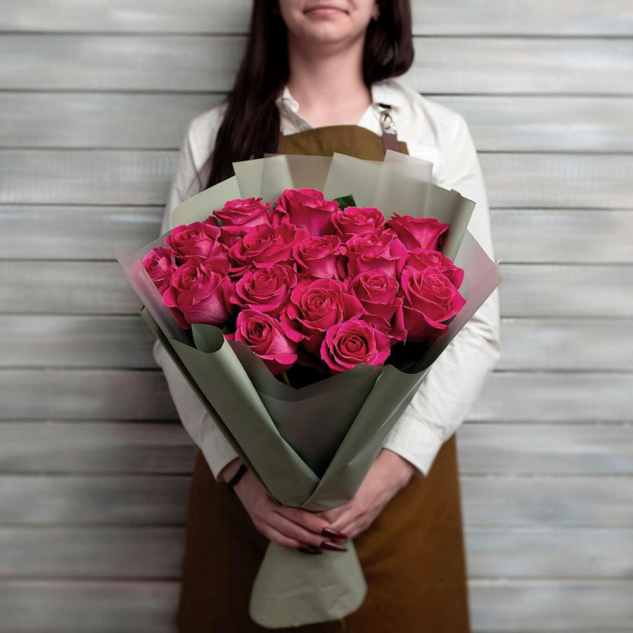 На фото 17 малиновых роз. В составе: роза 17 шт, дизайнерская упаковка 1 шт, атласная лента 2 шт, . Все цветы свежие и ароматные, букет красиво оформлен и отлично подходит для подарка. Доступна доставка цветов или самовывоз.
