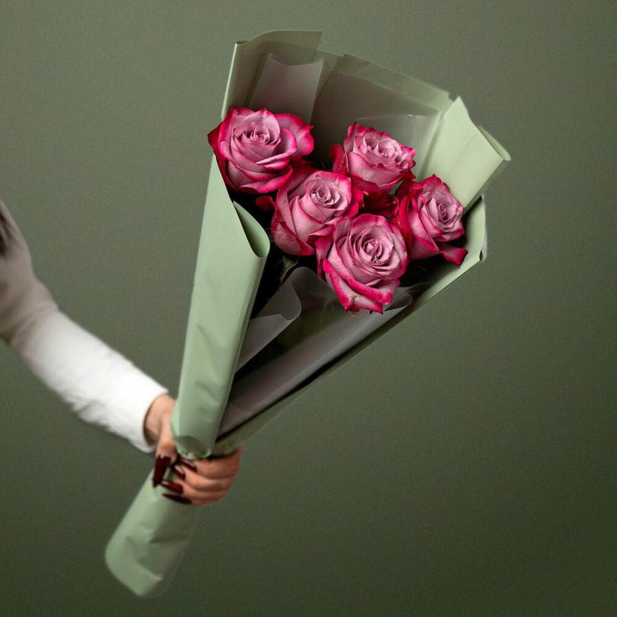 На фото букет из 5 фиолетовых роз. В составе: роза 5 шт, дизайнерская упаковка 1 шт, атласная лента 1 шт, . Все цветы свежие и ароматные, букет красиво оформлен и отлично подходит для подарка. Доступна доставка цветов или самовывоз.