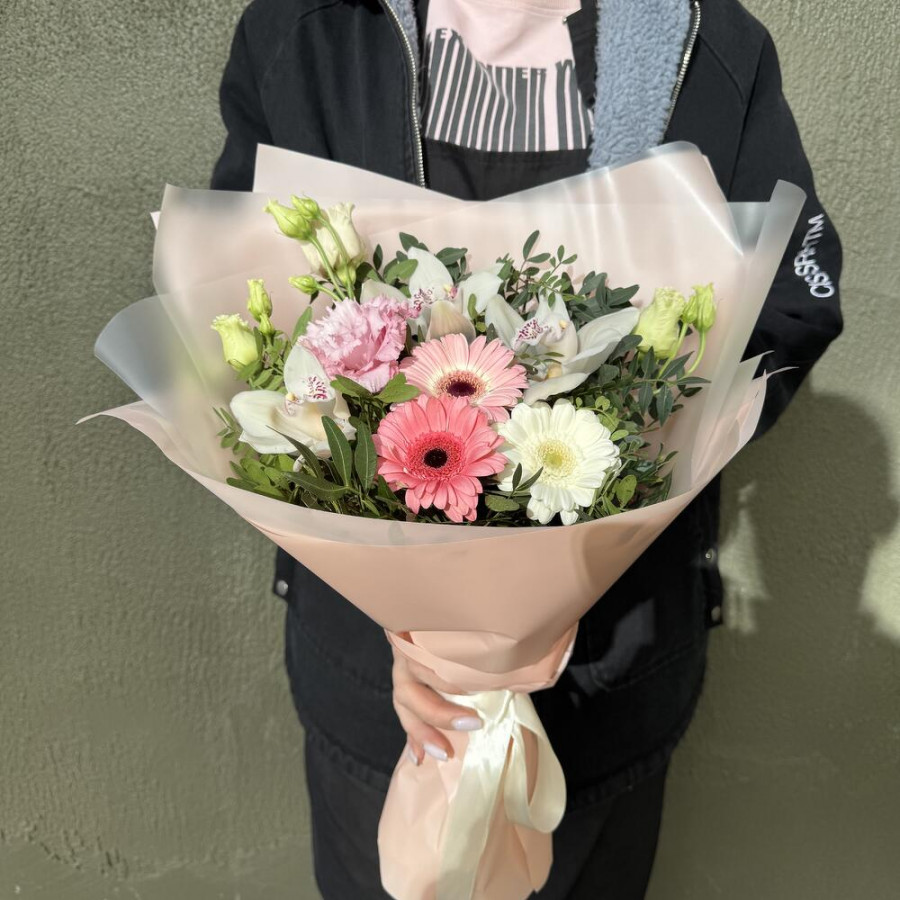 На фото букет «нежный роман». В составе: орхидея 3 шт, эустома (лизиантус) 1 шт, гербера 3 шт, писташ 5 шт, дизайнерская упаковка 1 шт, атласная лента 1 шт, . Все цветы свежие и ароматные, букет красиво оформлен и отлично подходит для подарка. Доступна доставка цветов или самовывоз.