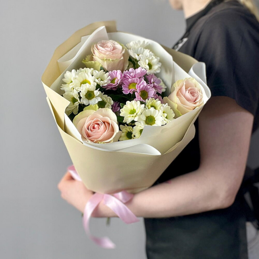 На фото букет «нежный свет». В составе: роза 3 шт, хризантема кустовая 4 шт, дизайнерская упаковка 1 шт, атласная лента 1 шт, . Все цветы свежие и ароматные, букет красиво оформлен и отлично подходит для подарка. Доступна доставка цветов или самовывоз.